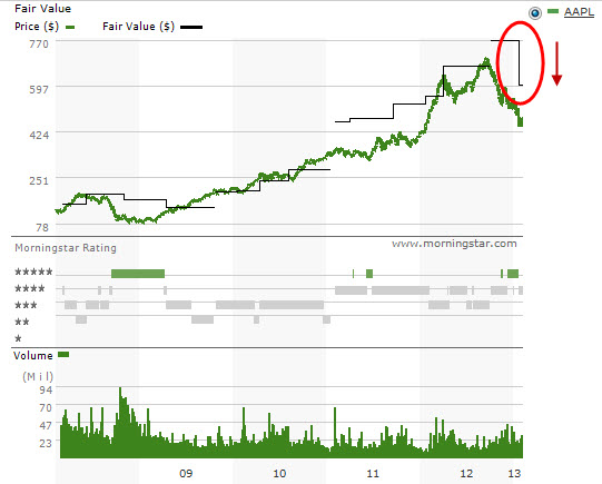 FYI … both Morningstar (from $770 to $600) and S&P have reduced their fair value estimates on Apple (AAPL) in recent days. Analyst consensus estimates for sales and EPS for years ending 9/30/2013 and 9/30/2014 also reduced. The impact on our return forecast will take it from 24% to 18-19% — still undervalued, just not as much. Point-and-figure (PnF) sentiment on www.stockcharts.com has turned “Prelim Bullish”.