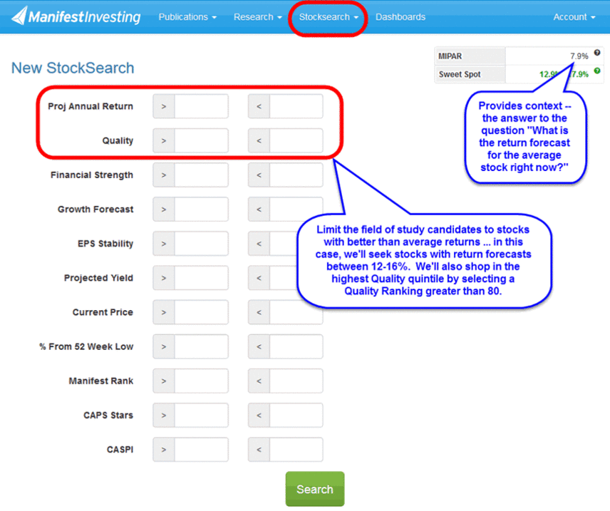 There are many, many screening programs out there — many of them screening on stuff that probably doesn’t matter quite as much. We focus instead on results. StockSearch is a results-based tool designed to serve our quest for better returns. The ability to screen on return forecasts is nearly exclusive to Manifest Investing. We believe you’ll quickly discover the power, simplicity and potential to seek better relative returns.