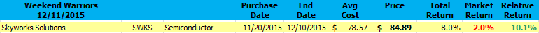 Skyworks Solutions (SWKS) was removed, or “sold” from the tracking portfolio after beating the market by 10 percentage points over the last few weeks. The SWKS PAR had dropped below our Sweet Spot.