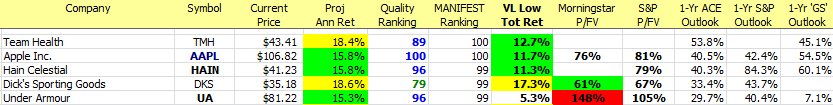 Here are five stocks that could be studied over the Christmas holidays. They essentially represent a listing of stocks with favorable short term total return forecasts (1 year, according to Analyst Consensus Estimates, or ACE) combined with strong long-term return forecasts and good/excellent quality rankings. This week’s Top One Percenters are Team Health (TMH), Hain Celestial (HAIN), Dick’s Sporting Goods (DKS), Under Armour (UA) and Apple (AAPL).