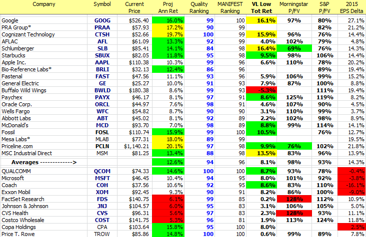 Where did we go hunting for our (20) stocks for 2015? Like we said, we like to shop in the same places as our like-minded long term investors. Therefore, we start with the MANIFEST 40, the forty most widely-followed stocks by Manifest Investing subscribers. We sort that by MANIFEST Rank, our combination ranking that includes a dash of return forecast and a dash of quality for a recipe that recognizes the top two characteristics for any investment. We also want to stick to stocks in the top quintile (MANIFEST Rank > 80) as we build for 2015. This yields about (24) stocks.