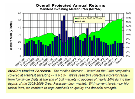 We have noted — over the years — that actual returns tend to more closely resemble the low return forecasts on the company research pages for Value Line. Since 2001, the average Value Line low total return forecast has been 7.9%. The actual returns over that time frame have been 6.5%.