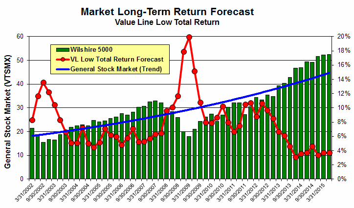 Value Line Low Total Return (VLLTR) Forecast. The long-term low total return forecast for the 1700 companies featured in the Value Line Investment Survey is 3.7%, a slight decrease from 3.8% last week. For context, this indicator has ranged from low single digits (when stocks are generally overvalued) to approximately 20% when stocks are in the teeth of bear markets like 2008-2009.