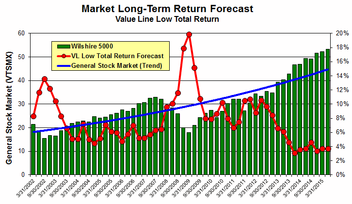 Value Line Low Total Return (VLLTR) Forecast. The long-term low total return forecast for the 1700 companies featured in the Value Line Investment Survey is 3.7%, unchanged from last week. For context, this indicator has ranged from low single digits (when stocks are generally overvalued) to approximately 20% when stocks are in the teeth of bear markets like 2008-2009.