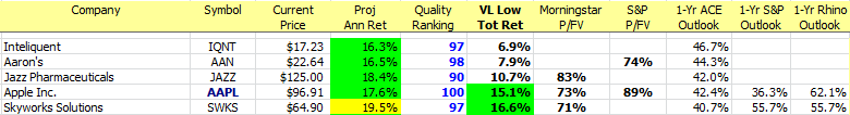 Our Fave Five essentially represents a listing of stocks with favorable short term total return forecasts (1 year, according to Analyst Consensus Estimates, or ACE) combined with strong long-term return forecasts and good/excellent quality rankings.