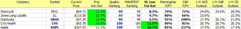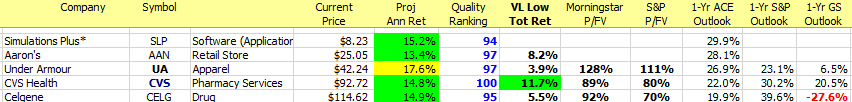 The Long & Short. (August 26, 2016) Projected Annual Return (PAR): Long term return forecast based on fundamental analysis and five year time horizon. Quality Ranking: Percentile ranking of composite that includes financial strength, earnings stability and relative growth & profitability. VL Low Total Return (VLLTR): Low total return forecast based on 3-5 year price targets via Value Line Investment Survey. Morningstar P/FV: Ratio of current price to fundamentally-based fair value via www.morningstar.com S&P P/FV: Current price-to-fair value ratio via Standard & Poor’s. 1-Year ACE Outlook: Total return forecast based on analyst consensus estimates for 1-year target price combined with current yield. The data is ranked (descending order) based on this criterion. 1-Year S&P Outlook: 1-year total return forecast based on S&P 1-year price target. 1-Yr GS: 1-year total return forecast based on most recent price target issued by Goldman Sachs.