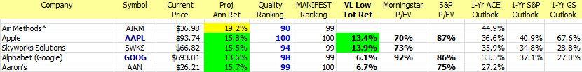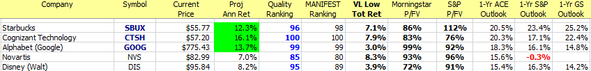 Our “forensic review” of Cramer’s stock selections once again underscores some of the challenges and differences in the analyst community. As shown here, there’s a lot of red ink dripping in the Value Line and Morningstar columns. In fact the average long-term return forecast for the Booyah 38 is 0.1%. Fair value is another long-term measure — derived from a discounted cash flow analysis — as performed by Morningstar, S&P and others … The comparison of current price to fair value (P/FV) displays stocks that are attractive (<100%) versus those considered overvalued (P/FV > 100%).