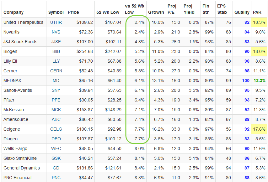 The following screening results intrigued us. We were simply seeking higher quality companies with decent return forecasts that are hovering near their 52-week lows, very much in the spirit of Hugh McManus and his bargain hunting mode.