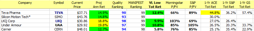 Newcomer Meridian Bioscience (VIVO) checks in at #1. VIVO is covered in the Value Line Standard Edition and had a 16% low total return forecast (11/18/2016). Meridian Bioscience provides diagnostic test kits, purified reagents and related products, as well as biopharmaceutical enabling technologies. Products are marketed to hospitals, laboratories, veterinary centers, physician offices, diagnostic manufacturers and biotech companies worldwide. The company is headquartered in Cincinnati, Ohio and investors are encouraged to explore the investor relations materials at: